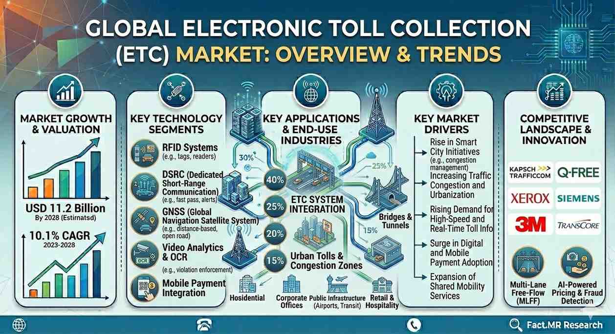 ROCKVILLE, MD, UNITED STATES, April 10, 2026 /EINPresswire.com/ — According to Fact.MR’s latest analysis, the South Korea electronic toll collection (ETC) market is witnessing steady growth driven by smart transport initiatives and modernization of highway infrastructure. The global ETC market is valued at USD 16.9 billion in 2026, expected to reach USD 18.7 billion in 2027, and projected to expand to USD 46.3 billion by 2036. South Korea’s demand is forecast to grow at 7.6% CAGR through 2036, supported by deployment of RFID-enabled tolling systems and increasing emphasis on cashless mobility.
