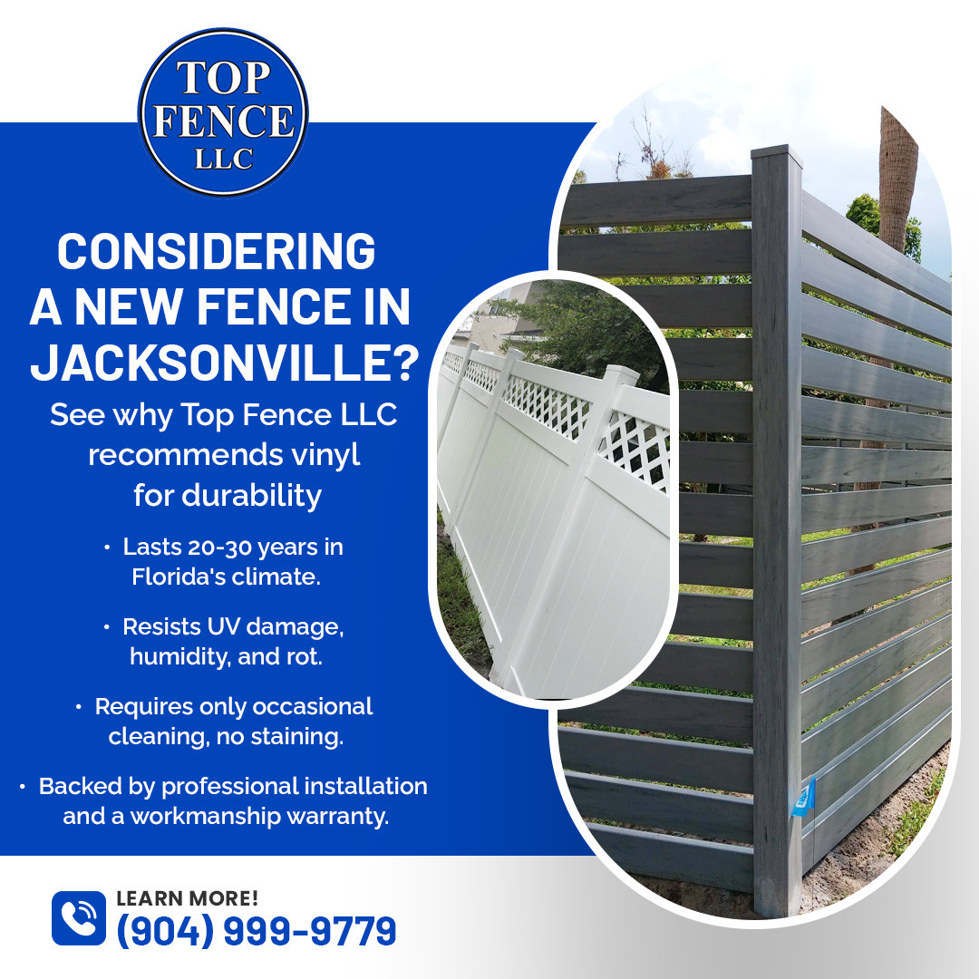 For more information about vinyl fences or to schedule a free consultation, contact Top Fence LLC at (904) 999-9779.