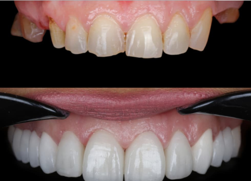 Image Alt text:Before and after porcelain veneers showing how cosmetic dental treatment at Ridgetop Dental transformed worn, discolored teeth into a bright, natural-looking smile.