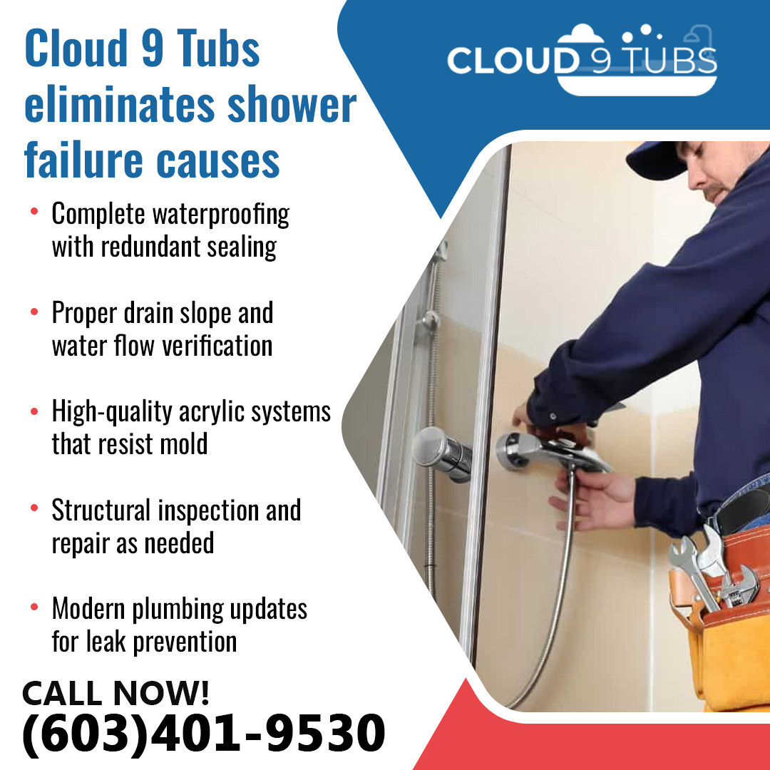 Salem, NH - Cloud 9 Tubs LLC is addressing the root causes of premature shower failure with expert shower replacement in Salem, NH. Many homeowners experience recurring leaks, mold, or structural damage within a few years of installation, often due to inadequate waterproofing, poor drain slope, or substandard materials. Cloud 9 Tubs eliminates these risks by providing replacements built on proven preparation, quality materials, and professional standards.